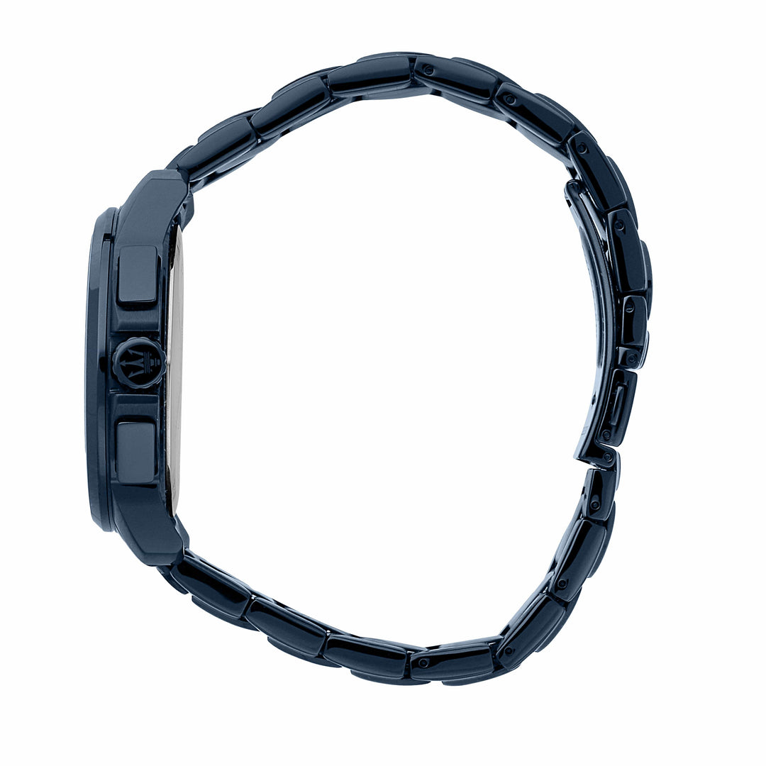 Cutting-edge technical solutions are behind the watches from Maserati Successo Solar collection, creating technical masterpieces such as this Maserati Successo Solar Blue Chronograph Watch. Watches powered by solar cells that capture natural and artificial light and transform it into energy for the movement (chrono and 3H). Their autonomy, when fully wound, is approximately four months. A sporty look with a 44mm case for the men's version, which features dials with luminescent indexes and hands, contrasting finishes and a power reserve indicator.
