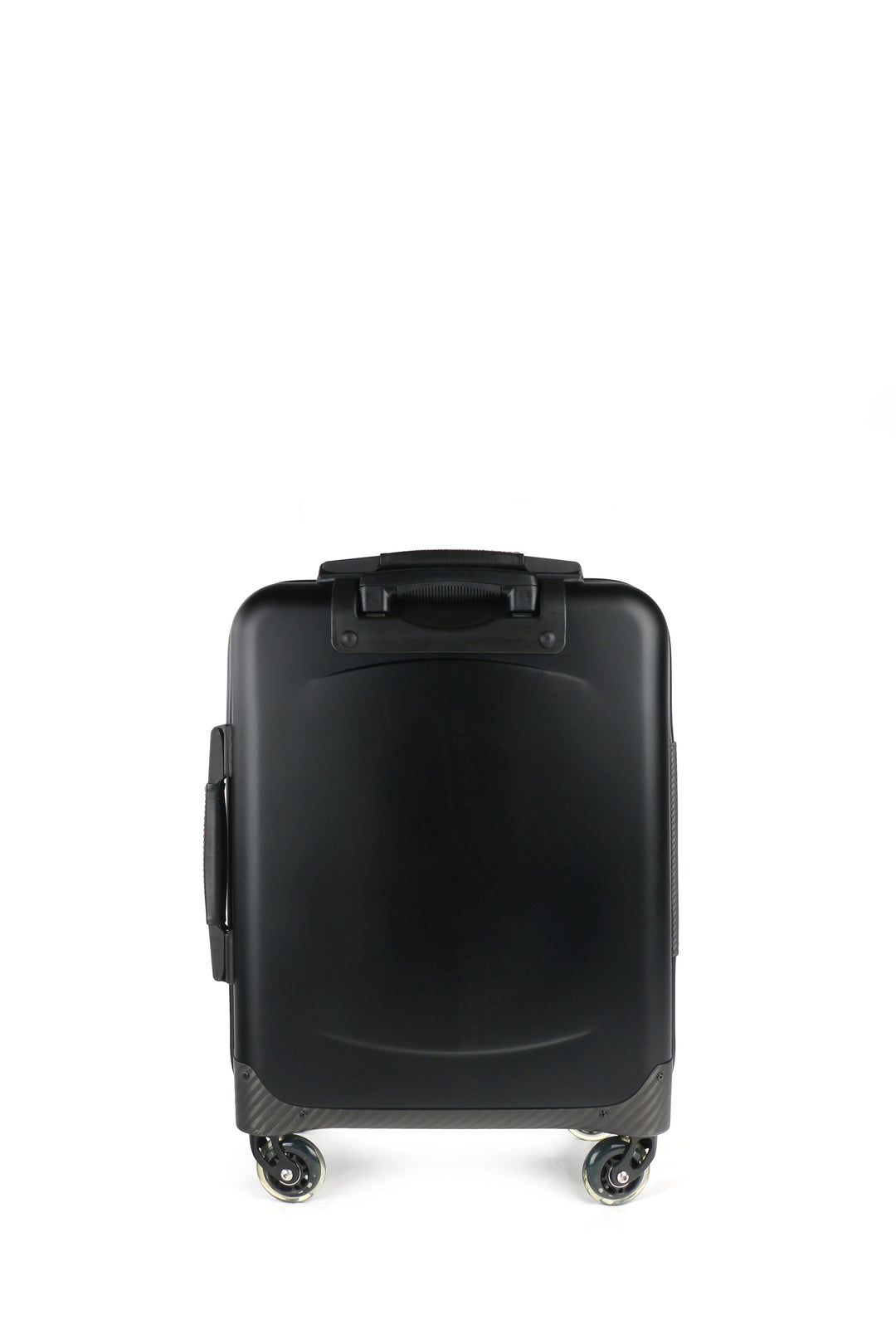 Trolley 4 wheels in Glacies Carbon fiber autoclaved monocoque and black anodized aluminum, with zippered closure. Very resistant wheels supports in aluminum, 360° pivoting, ultra silent. Telescopic handle 3 stages . Frontal alcantara quilted pocket.