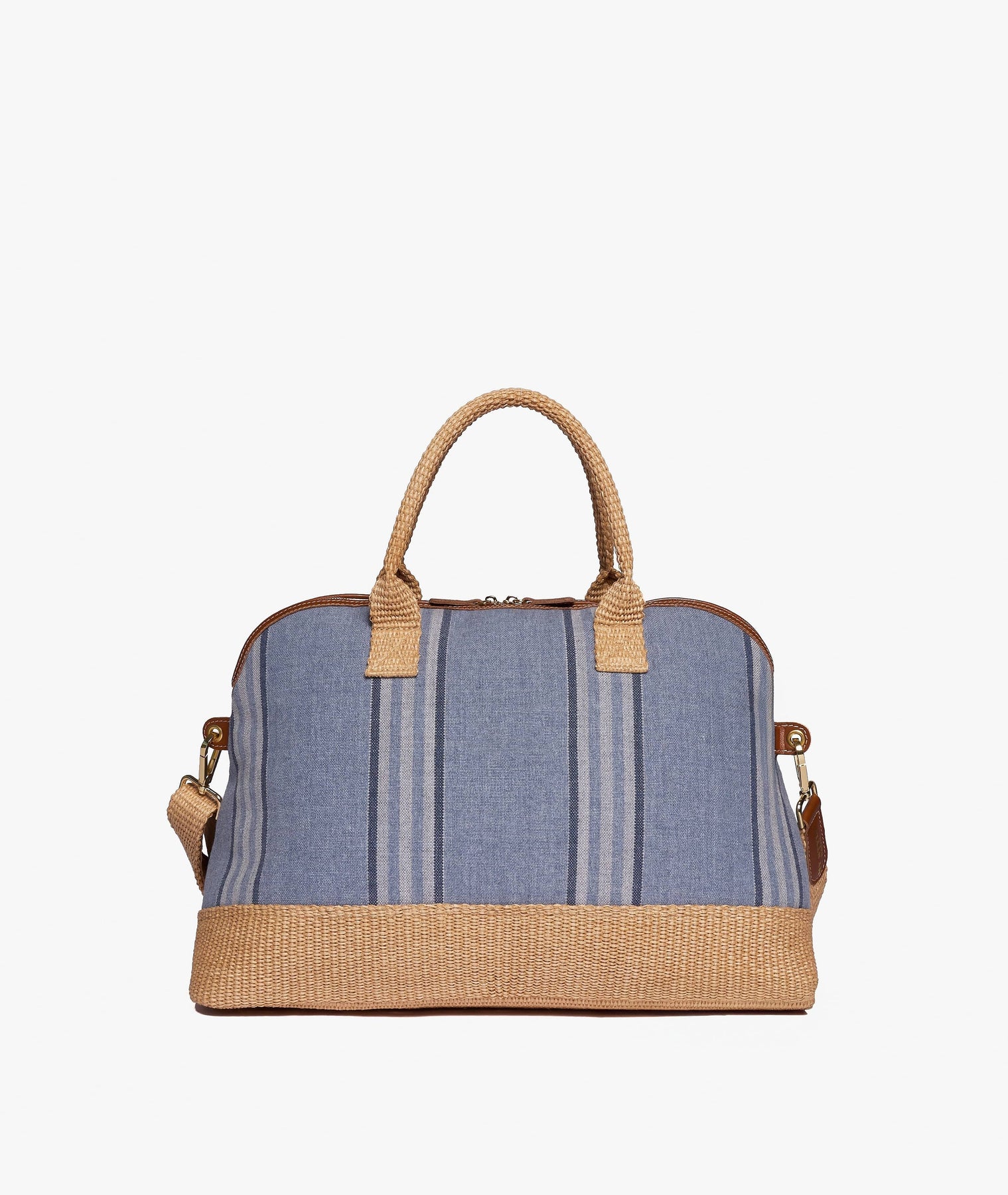 The London Smart Antibes Travel Duffle Bag in Sugar Paper Blue expresses Mediterranean elegance in a deep, refined shade inspired by coastal greenery and the sunlit Riviera. The striped fabric in green, sand, and ivory creates a natural, sophisticated colour balance, while the woven straw-effect base and handles add a distinctive textured detail with timeless resort appeal.